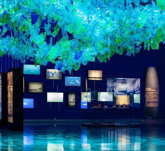 El diseño de la exposición propuso una atmósfera inmersiva compatible con público de todas las edades, buscando un efecto de sinestesia a través de instalaciones que articulaban objetos reales con estímulos audiovisuales. La apuesta por los sentidos buscó recrear el fondo marino a través de texturas y atmósferas profundas. Los protagonistas de la muestra fueron las seis especies de ballenas que habitan la costa chilena, junto a la amenaza ecológica que asedia al océano. Para esto implementamos dos instalaciones; una con los esqueletos reales y la proyección audiovisual de los cantos de las ballenas, y otra que reproducía la superficie del mar en el cielo, compuesta por botellas de plástico recolectadas de la costa de nuestro país. La invitación fue a sumergirse en la realidad del ecosistema marino y comprometernos con este como agentes de cambio.