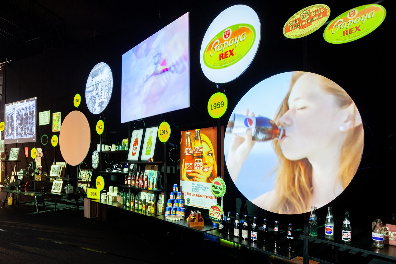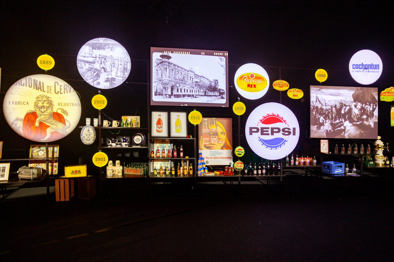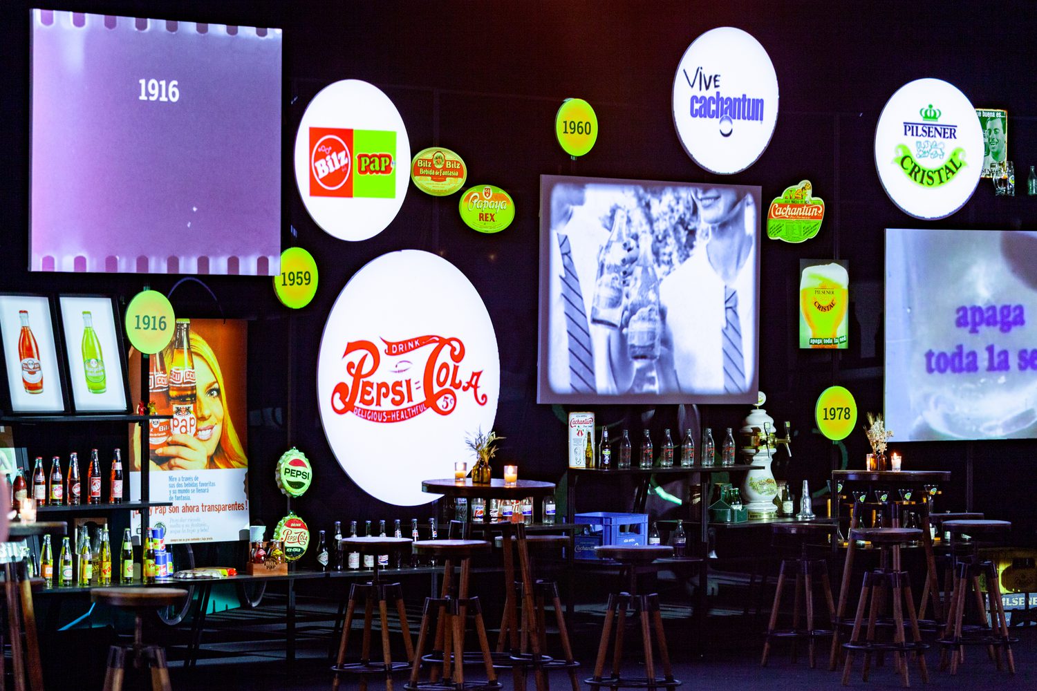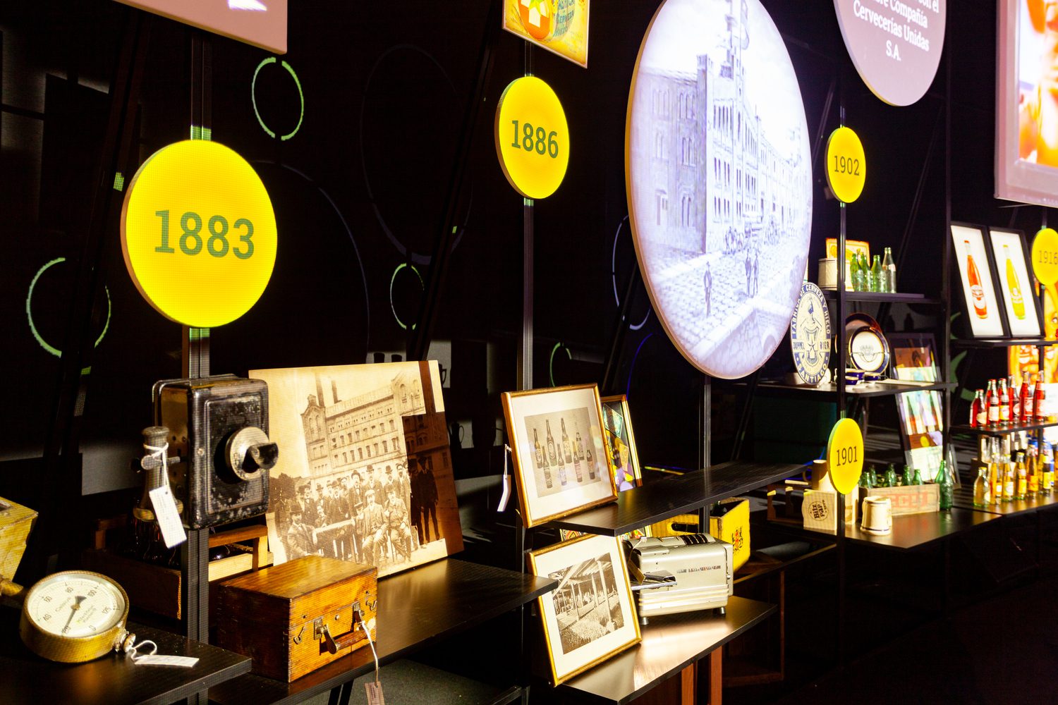A museographic installation showcasing heritage objects, analog graphics, and archival audiovisual materials, accompanied by a large beer bar that brought together CCU’s diverse product portfolio — inviting guests to reconnect with the company’s origins and its brewing tradition.