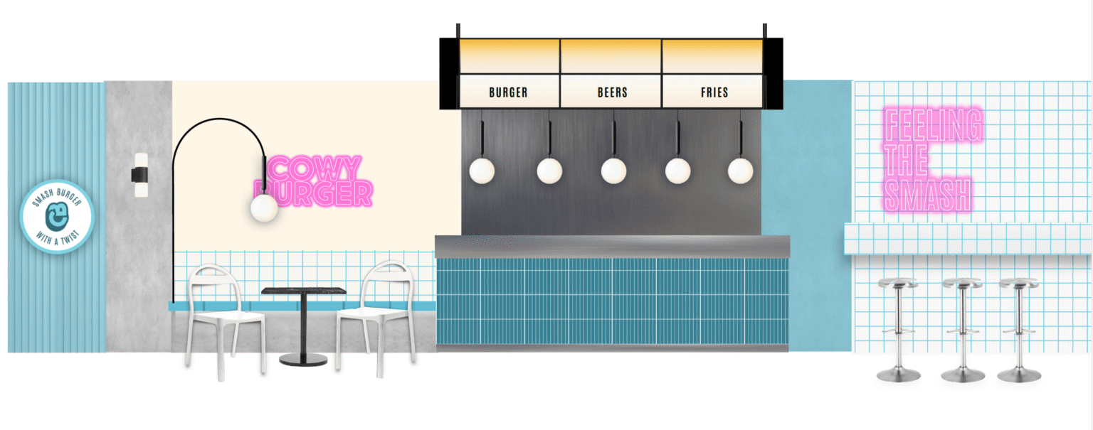Cowy Burgers no solo pasa de los módulos POP a un espacio físico, sino que abraza su nuevo entorno con un diseño que celebra la cultura urbana y conecta a través de la experiencia visual, sensorial y culinaria.