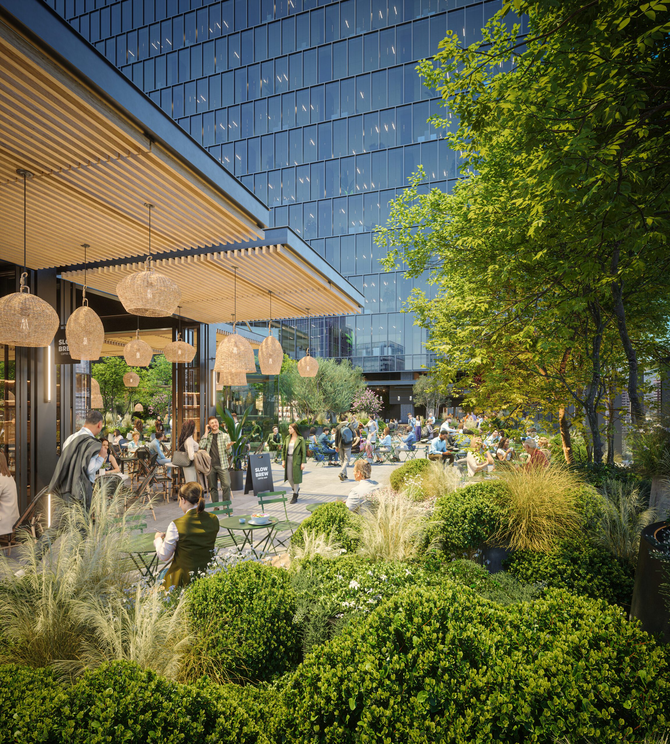 El diseño interior está cuidadosamente planeado para transportar a los visitantes a un ambiente donde el verde es el protagonista. La vegetación crea una atmósfera fresca y viva, en armonía con estructuras modernas y materiales nobles como madera, acero, ladrillo y vidrio. Se busca maximizar la conexión con el exterior, permitiendo vistas panorámicas y creando una experiencia inmersiva de descanso y socialización bajo el cielo abierto.
