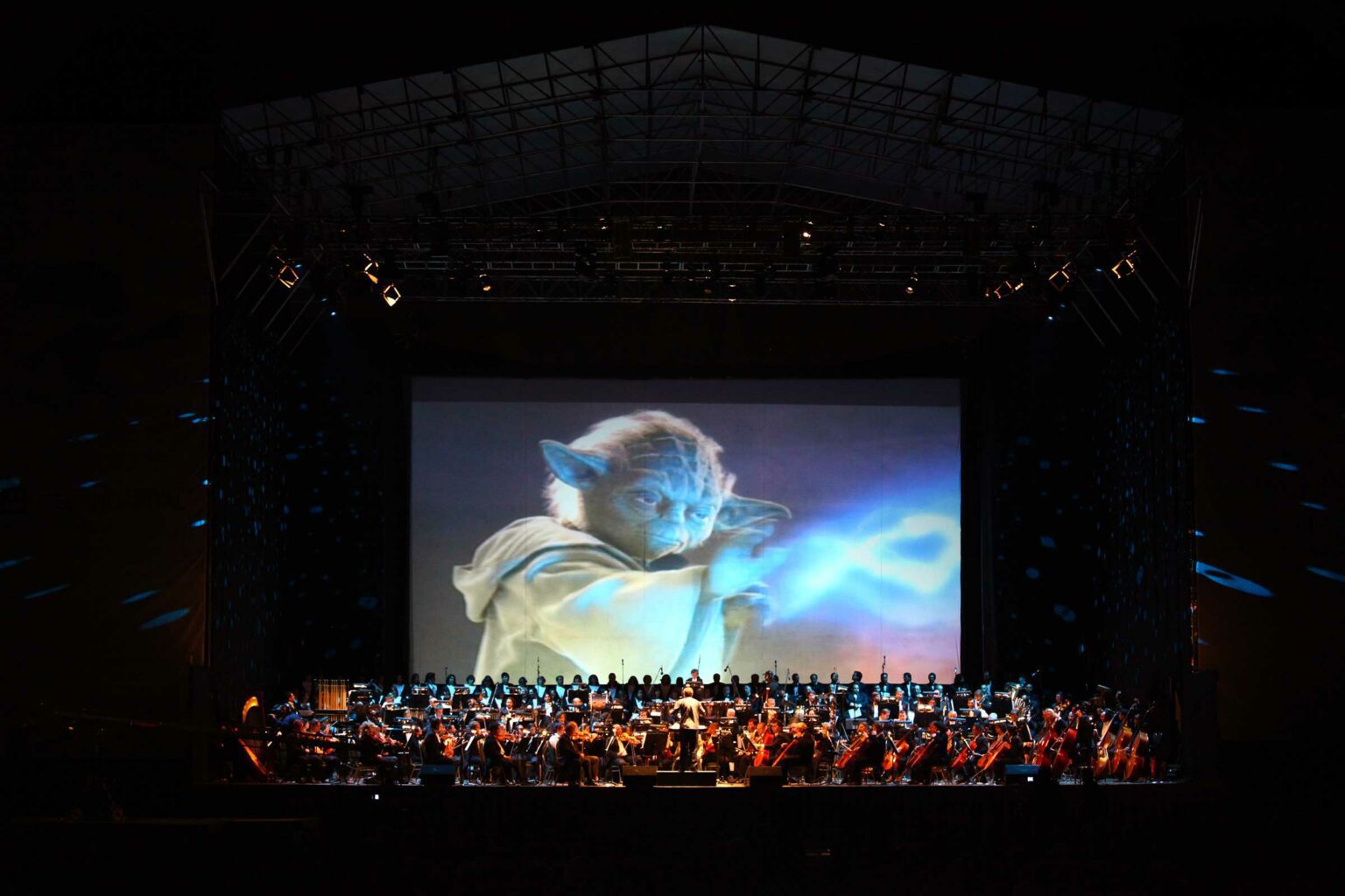 El encargo consistió en desarrollar la puesta en escena para el concierto, el cual fue resuelto potenciando el valor musical del evento a través de una ambientación que complemente la experiencia, representando de manera abstracta y literal cada película. Al tratarse de melodías conocidas popularmente, gracias al recuerdo que dejaron las cintas en la memoria colectiva, la imagen se utilizó de forma sugerente, permitiendo que la idea total sea producto de la imaginación del espectador junto a la música. Trabajamos en conjunto al crítico de cine Leopoldo Muñoz, seleccionando contenido visual breve característico de cada filme, objetivamente fragmentos que sensibilicen y conecten directamente al espectador con la película. Trabajamos bajo un criterio de elección de escenas icónico a todas las películas, enfatizando en color y elementos dramáticos. Logramos abstraer las imágenes combinándolas con trabajo de iluminación. La escenografía buscó generar un ambiente homogéneo, utilizando una pantalla de fondo simulamos una caja negra, aludiendo al espacio cinematográfico. La ambientación permitió desarrollar un criterio de diseño para público en vivo y espectadores televisivos, dando una adecuada visibilidad para la transmisión que realizó Canal 13 del evento.